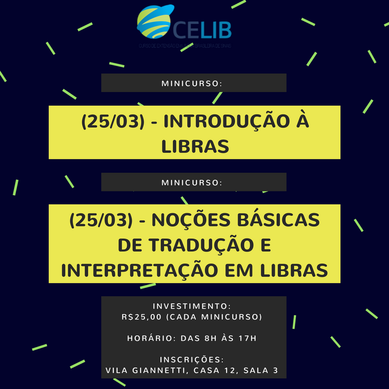Fiquem atentos aos minicursos do CELIB que acontecerão neste sábado (25) das 8h às 17h!